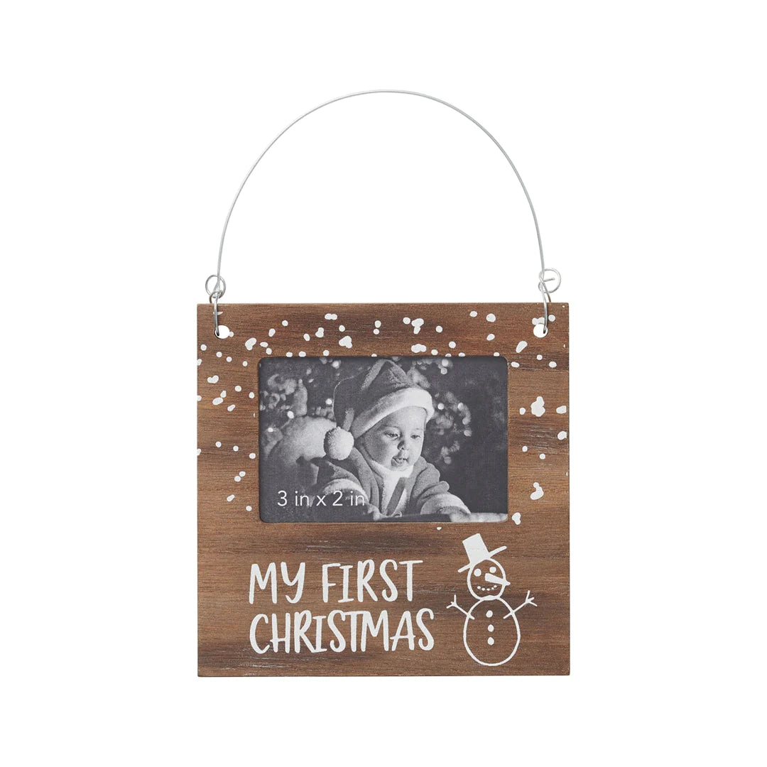 Wood Photo Frame Ornament, White Text, Artwork of Snowman and Snow, and Metal Hanger.