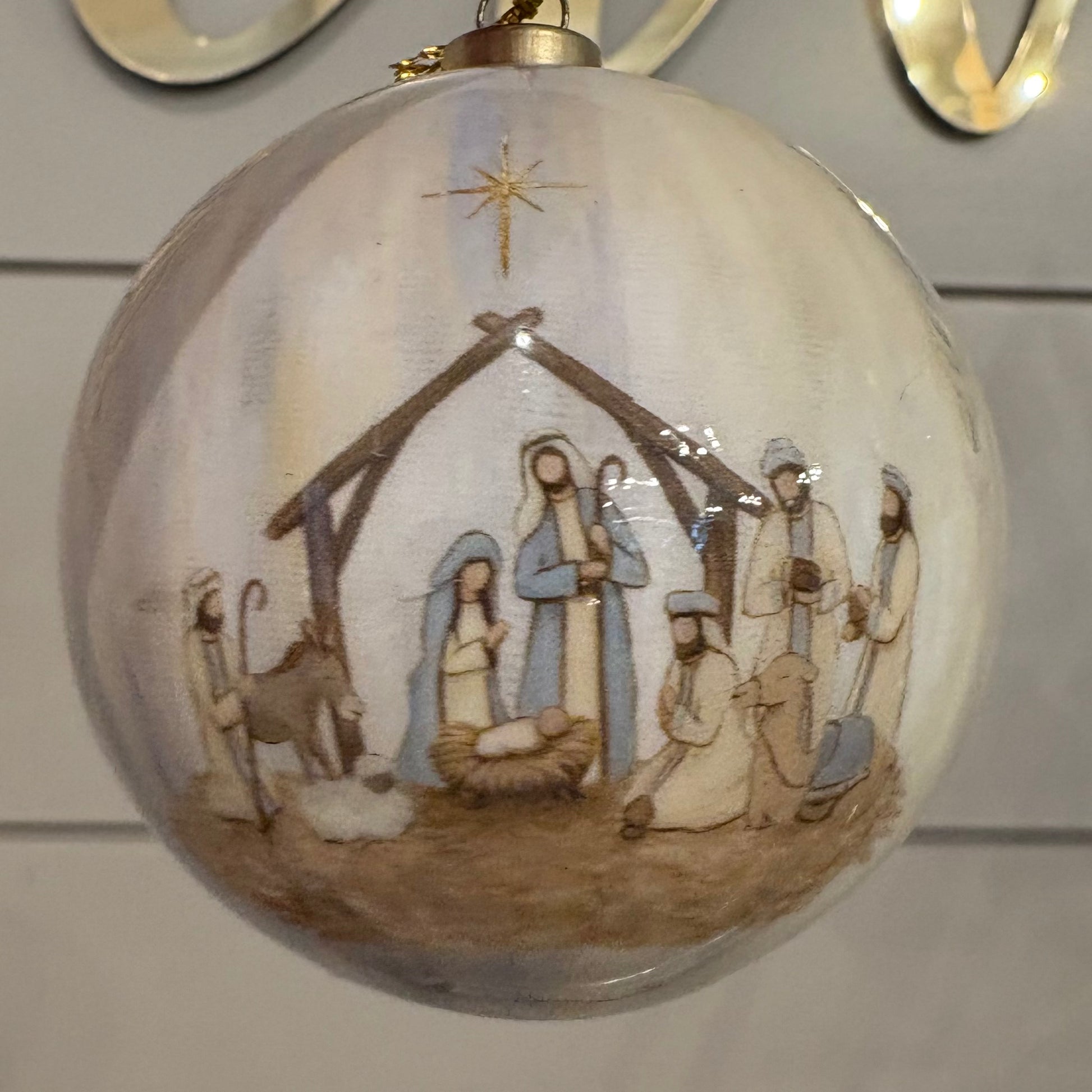 Assortment of Nativity ornaments. Blue and white watercolor background with 4 different designs. Assortment includes Holy family with message, "Love Came Down", Mary with baby Jesus, with message, "Oh Holy Night", Holy family under creche, with message, "All is Calm", and Nativity scene with message, "Joy to the World".
