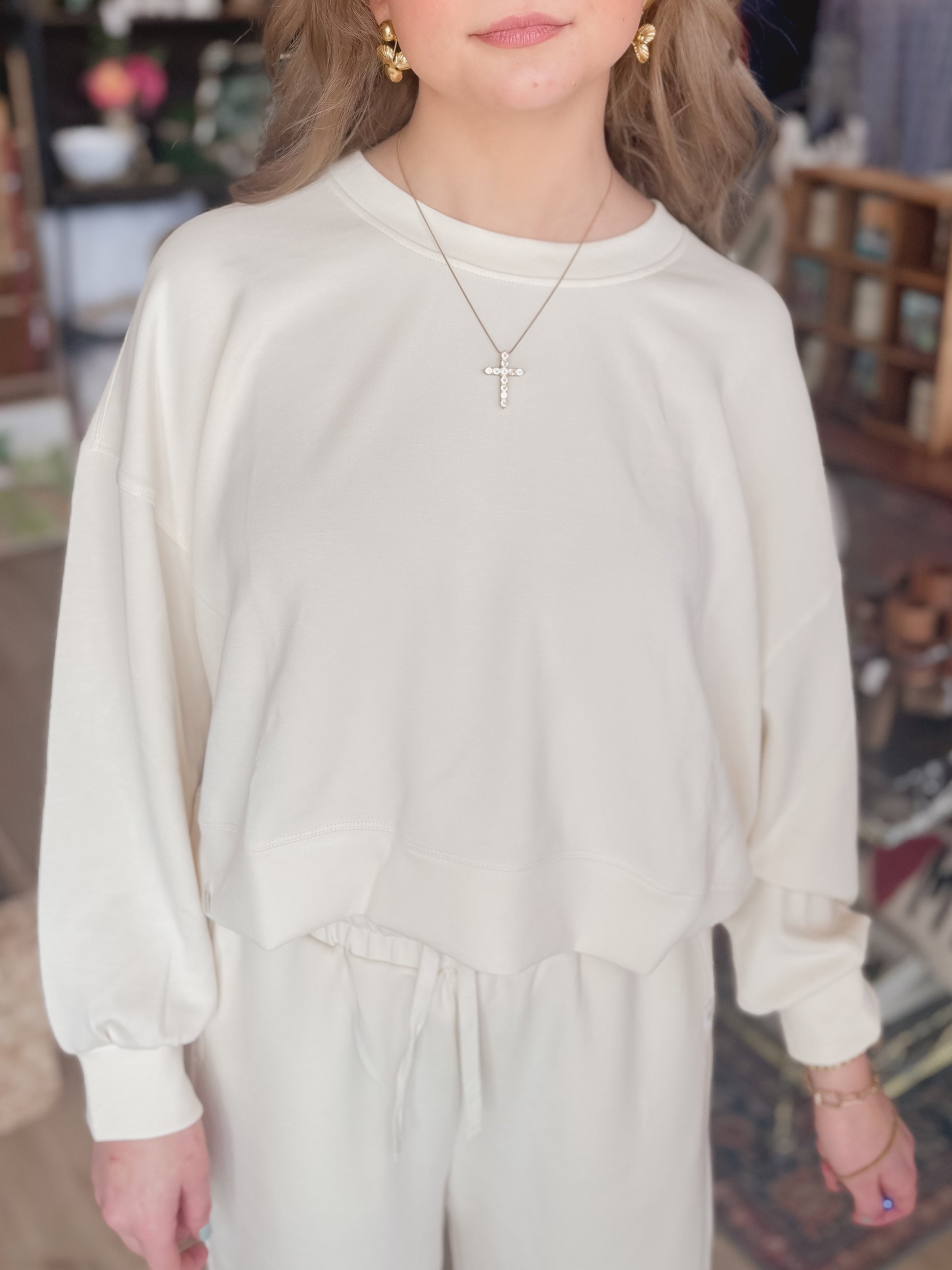 This adorable crew neck pullover features, rib crew neckline, rib cuffs, Simply Southern logo hem label. Made 48% modal 48% polyester 4% elastane. Pairs perfectly with Sophie Shorts or the Sloan Pants