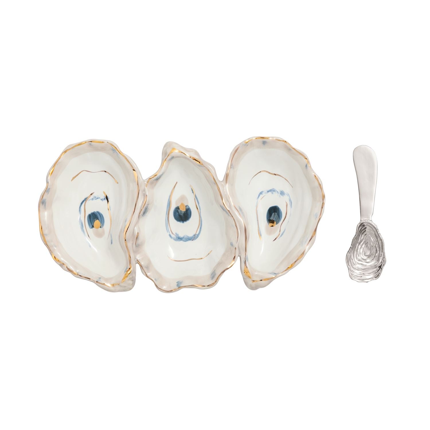 2-piece set. Stoneware oyster shell triple tidbit dish with hand-painted details. Comes with metal spreader with oyster shell handle.