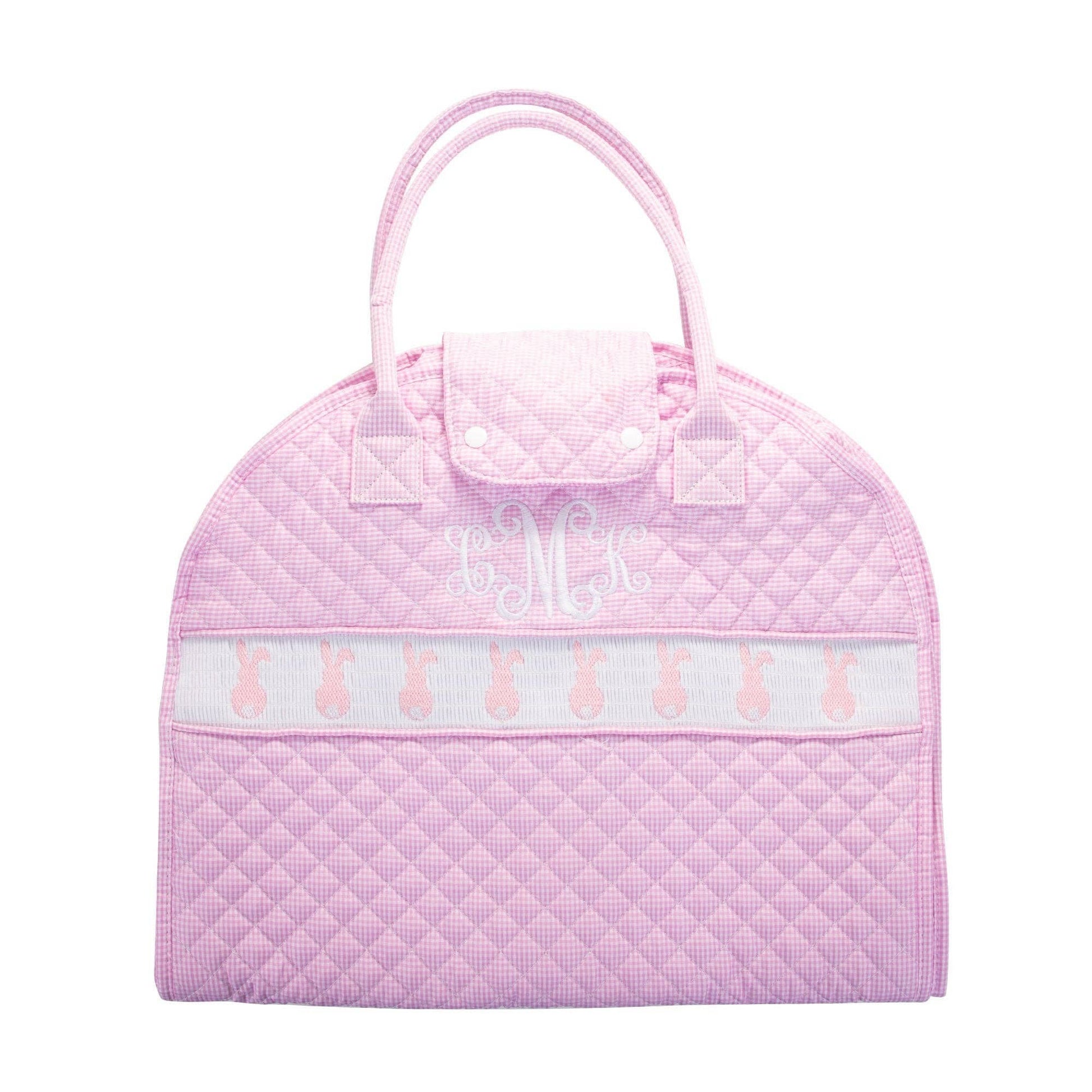 This smocked Pink Bunny garment bag made with quilted pink, 100 percent cotton gingham is just about the cutest thing you have ever seen! Perfect for carrying the Christening garments to and from church and for that first sleepover at Grandmother's house! It includes a zip closure from the top down one side and snaps on the flap to hold together when folded. Handles make for easy toting!