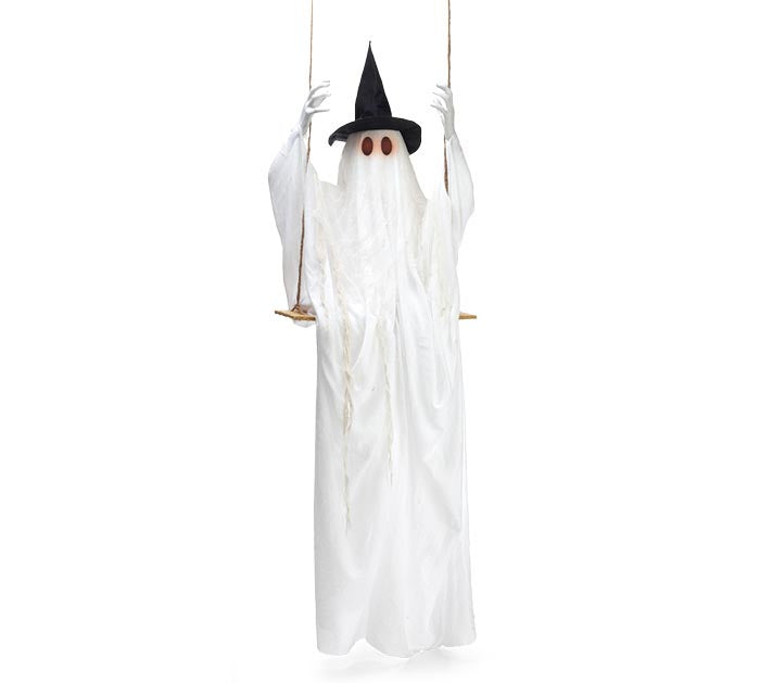 Give Trick-or-Treaters a good scare with our Swinging Ghoul Animatronic! He’s your stereotypical white ghost, hanging out on a swing… guests won’t know what hit them once he starts! This ghoul is sound activated, and he makes groaning/giggly witch noises as it shakes. Runs off of 3AA batteries, which are included. On and off switch, no timer.