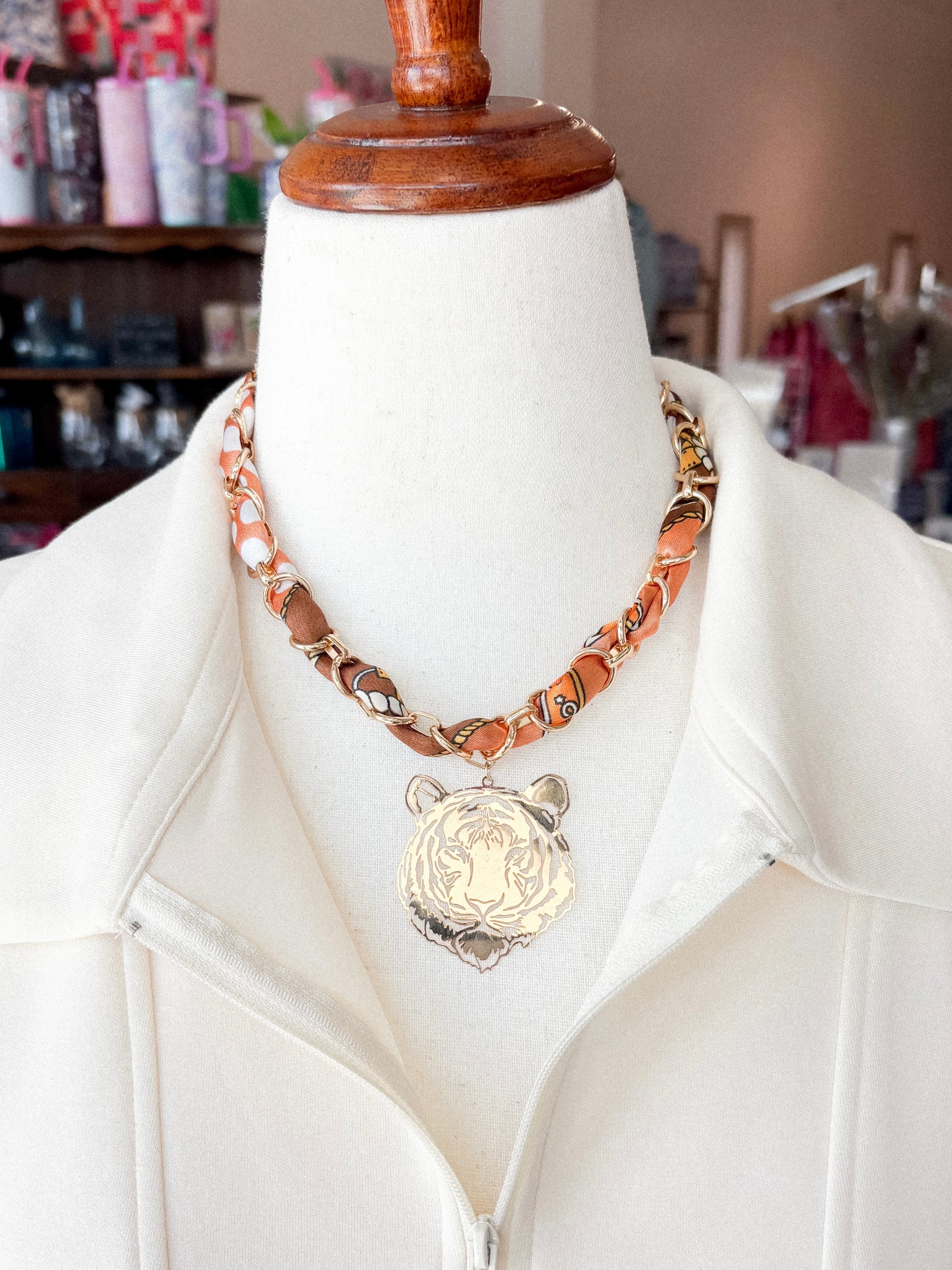 Embrace your wild side with the Tigris Scarf Necklace, a handmade piece by Kingstree local Glorianna Flintchum. The perfect accessory to add a touch of fierceness to any outfit, combining fashion and quality. Let your inner Tiger roar proudly with this unique scarf necklace.